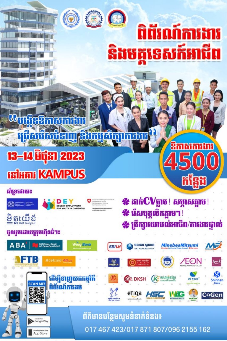 រាជរដ្ឋាភិបាលកម្ពុជា តាមរយៈទីភ្នាក់ងារជាតិមុខរបរ និងការងារ (NEA) នៃក្រសួងការងារ និងបណ្តុះបណ្តាលវិជ្ជាជីវៈ សហការជាមួយសហភាពសហព័ន្ធយុវជនកម្ពុជា រាជធានីភ្នំពេញ និងគាំទ្រដោយអង្គការអន្តរជាតិខាងការងារ (ILO ) នឹងរៀបចំ៖ “ពិព័រណ៍ការងារ និងមគ្គទេសក៍អាជីព” ផ្តល់ឱកាសការងារសរុបប្រមាណ ៤៥០០ កន្លែង ពីក្រុមហ៊ុនធំៗជិត ៣០ នៅអគារ Kampus ជិតស្ពានអាកាសក្បាលថ្នល់ រយៈពេលពីរថ្ងៃ គឺថ្ងៃទី១៣-១៤ ខែមិថុនា ឆ្នាំ២០២៣ ខាងមុខនេះ។