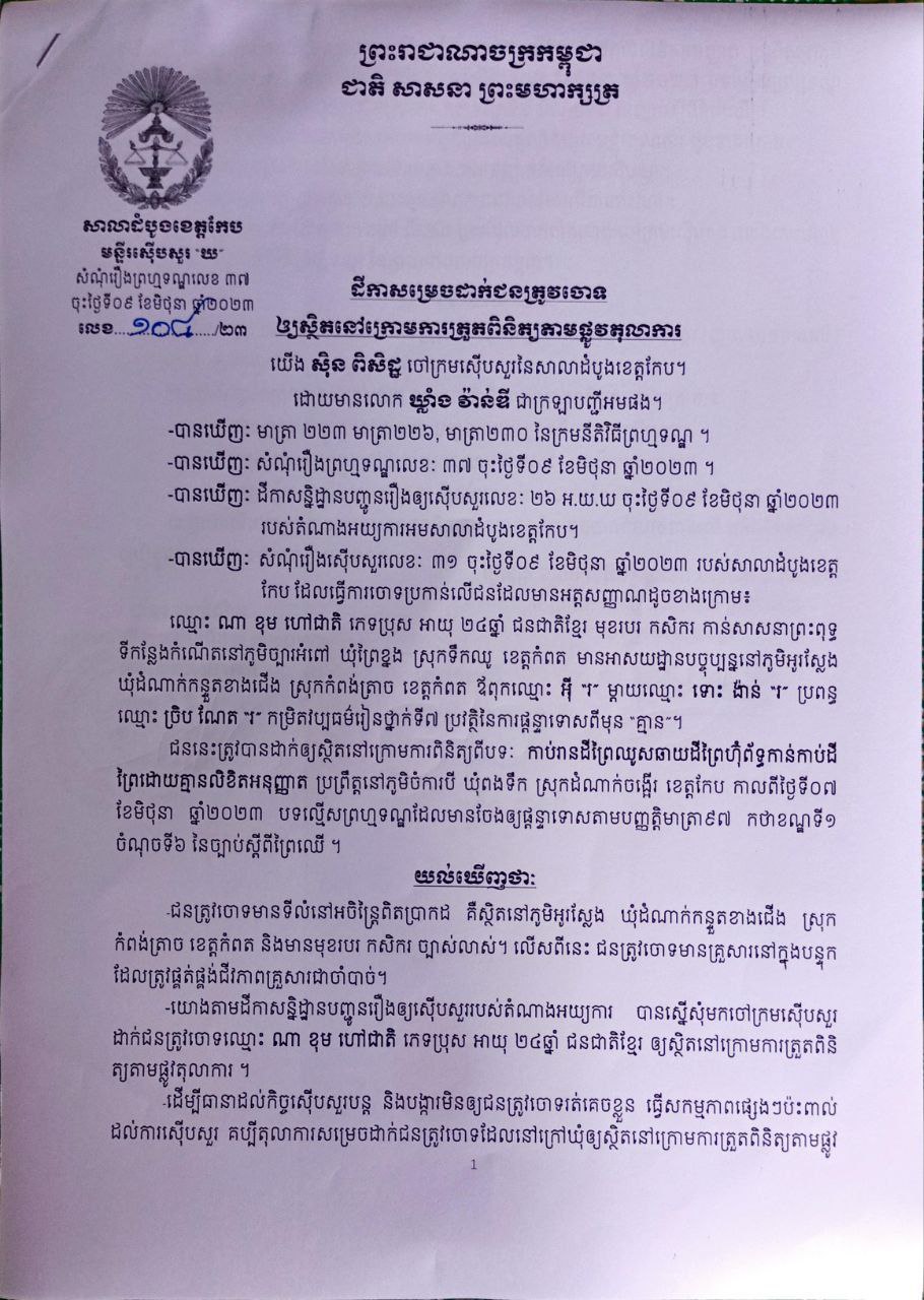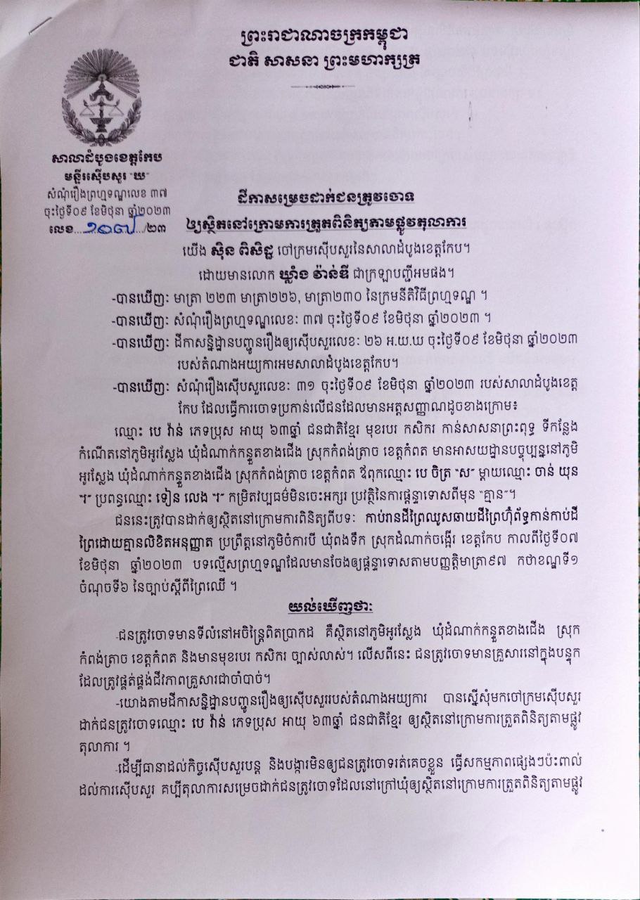 បានឃើញ ៖ សំណុំរឿងស៊ើបសួរលេខ ៣១ ចុះថ្ងៃទី០៩ ខែមិថុនា ឆ្នាំ២០២៣ របស់សាលាដំបូងខេត្តកែប។បើតាមដីកាលេខ ១០៦/ ១០៧/១០៨/១០៩/២៣ ចុះថ្ងៃទី០៩ ខែមិថុនា ឆ្នាំ២០២៣ របស់ លោក ស៊ិន ពិសិដ្ធ ចៅក្រមស៊ើបសួរនៃសាលាដំបូងខេត្តកែប និងដោយយល់ឃើញថា ជនត្រូវចោទមានទីលំនៅអចិន្ត្រៃយ៍ពិតប្រាកដ គឺស្ថិតនៅភូមិអូរស្លែង ឃុំដំណាក់កន្ទួតខាងជើង ស្រុកកំពង់ត្រាច ខេត្តកំពត មានមុខរបរច្បាស់លាស់ និងមានគ្រួសារនៅក្នុងបន្ទុកដែលត្រូវផ្គត់ផ្គង់ជីវភាពគ្រួសារចាំបាច់ ទើបតុលាការសម្រេចដោះលែងជនត្រូវចោទទាំង ៤នាក់ឲ្យនៅក្រៅឃុំដោយដាក់ឲ្យស្ថិតនៅក្រោមការត្រួតពិនិត្យតាមផ្លូវតុលាការ។