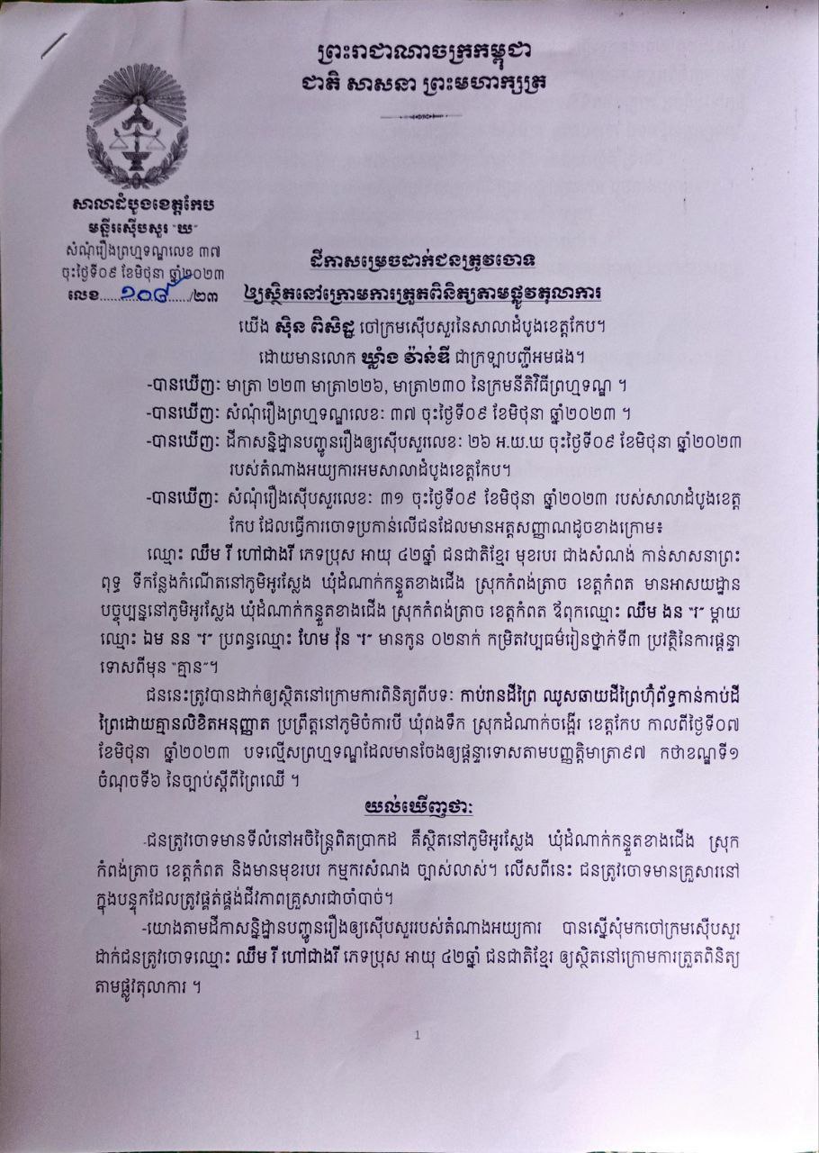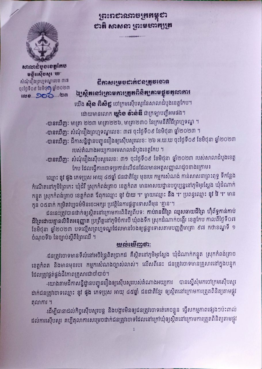 ខេត្តកែប៖ ចៅក្រមស៊ើបសួរ នៃសាលាដំបូងខេត្តកែប លោក ស៊ិន ពិសិដ្ឋ បានចេញដីកាសម្រេច ដាក់ជនត្រូវចោទចំនួន ៤នាក់រួមមាន៖ឈ្មោះ ឈឹម រ៉ី ភេទប្រុស អាយុ៤២ ឆ្នាំ មុខរបរជាងសំណង់ , ឈ្មោះ បេ វ៉ាន់ ភេទប្រុស អាយុ៥២ឆ្នាំ មុខរបរកសិករ , ឈ្មោះ ខូវ ផូង ភេទប្រុស អាយុ៤៥ឆ្នាំ មុខរបរកម្មករសំណង់ , ឈ្មោះ ណា ខុម អាយុ២៤ឆ្នាំ មុខរប រកសិករ នាក់ទាំង៤មានទីលំនៅ ភូមិអូរស្លែង ឃុំដំណាក់ កន្ទួតខាង ជើង ស្រុកកំពង់ត្រាច ខេត្តកំពត ដែលពាក់ព័ន្ធការ កាប់រានដីព្រៃ ឈូសឆាយដីព្រៃ ហ៊ុមព័ទ្ធកាន់កាប់ដីព្រៃដោយគ្មានលិខិតអនុញ្ញាតប្រព្រឹត្តនៅភូមិចំការបី ឃុំពងទឹក ស្រុកដំណាក់ចង្អើរ ខេត្តកែប កាល ពីថ្ងៃទី០៧ ខែមិថុនា ឆ្នាំ២០២៣ បទល្មើសព្រហ្មទណ្ឌដែលមានចែងផ្តន្ទាទោសតាមបញ្ញត្តិមាត្រា៩៧ កថាខណ្ឌទី១ ចំណុចទី៦ នៃច្បាប់ស្តីពី ព្រៃឈើ ឲ្យស្ថិតនៅក្រោមការត្រួតពិនិត្យតាមផ្លូវតុលាការ។