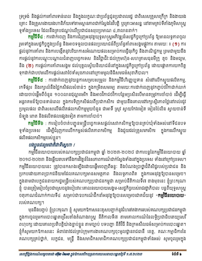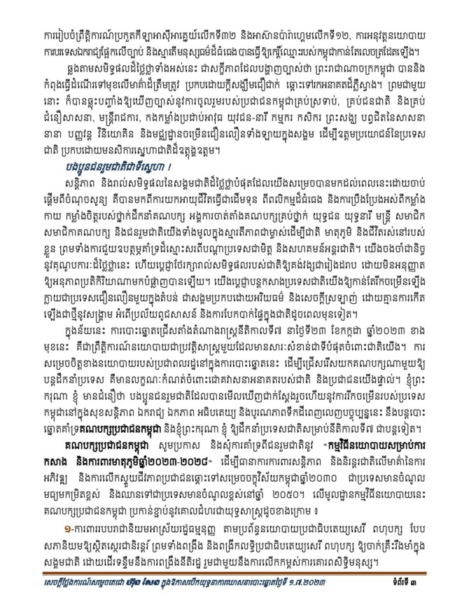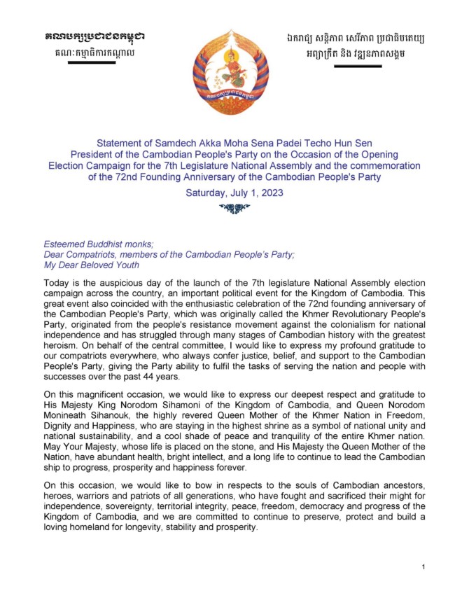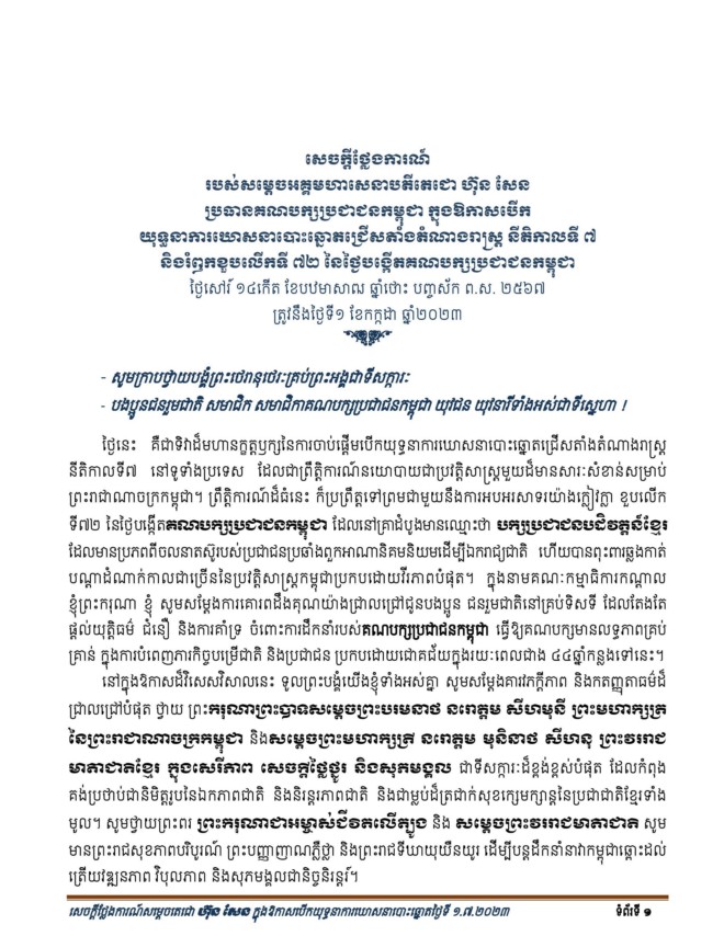 (ភ្នំពេញ)៖ នៅព្រឹកថ្ងៃទី០១ ខែកក្កដា ឆ្នាំ២០២៣ សម្តេចតេជោ ហ៊ុន សែន ប្រធានគណបក្សប្រជាជនកម្ពុជា បានអញ្ជើញប្រកាសបើកយុទ្ធនាការឃោសនាបោះឆ្នោតជ្រើសតាំងតំណាងរាស្ត្រ នីតិកាលទី៧ និងពិធីរំឭកខួបលើកទី៧២ នៃថ្ងៃបង្កើតគណបក្សប្រជាជនកម្ពុជា។