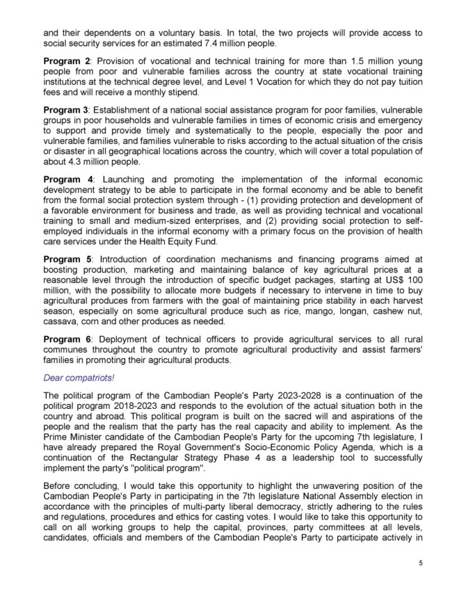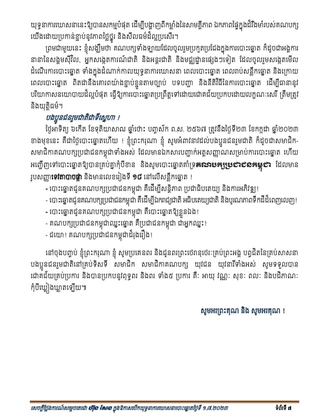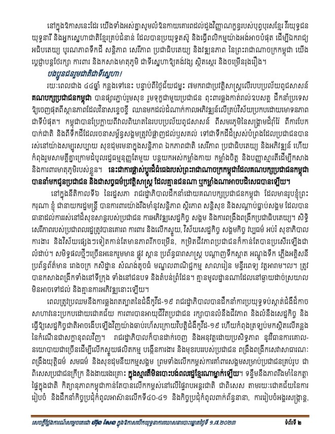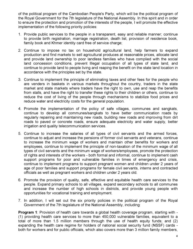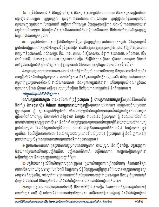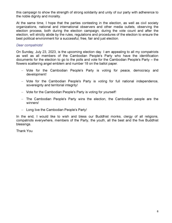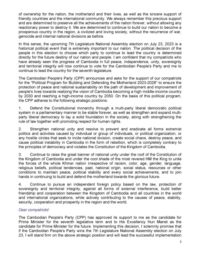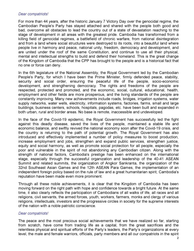 ក្នុងឱកាសនោះសម្តេចតេជោ ហ៊ុន សែន បានប្រកាសចេញនូវសេចក្តីការណ៍ពិសេស (ចំនួន៧ទំព័រ) ដែលមានខ្លឹមសារទាំងស្រុង៖