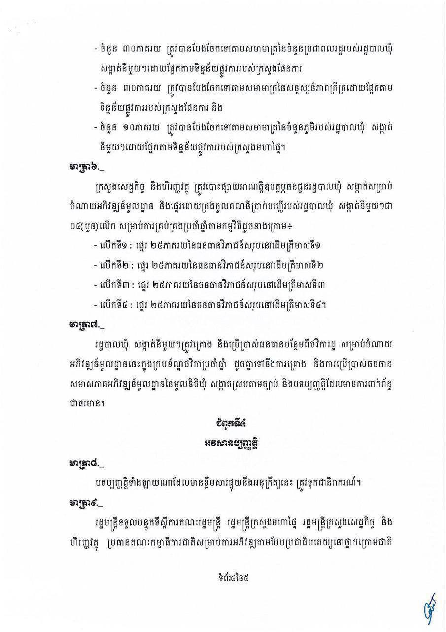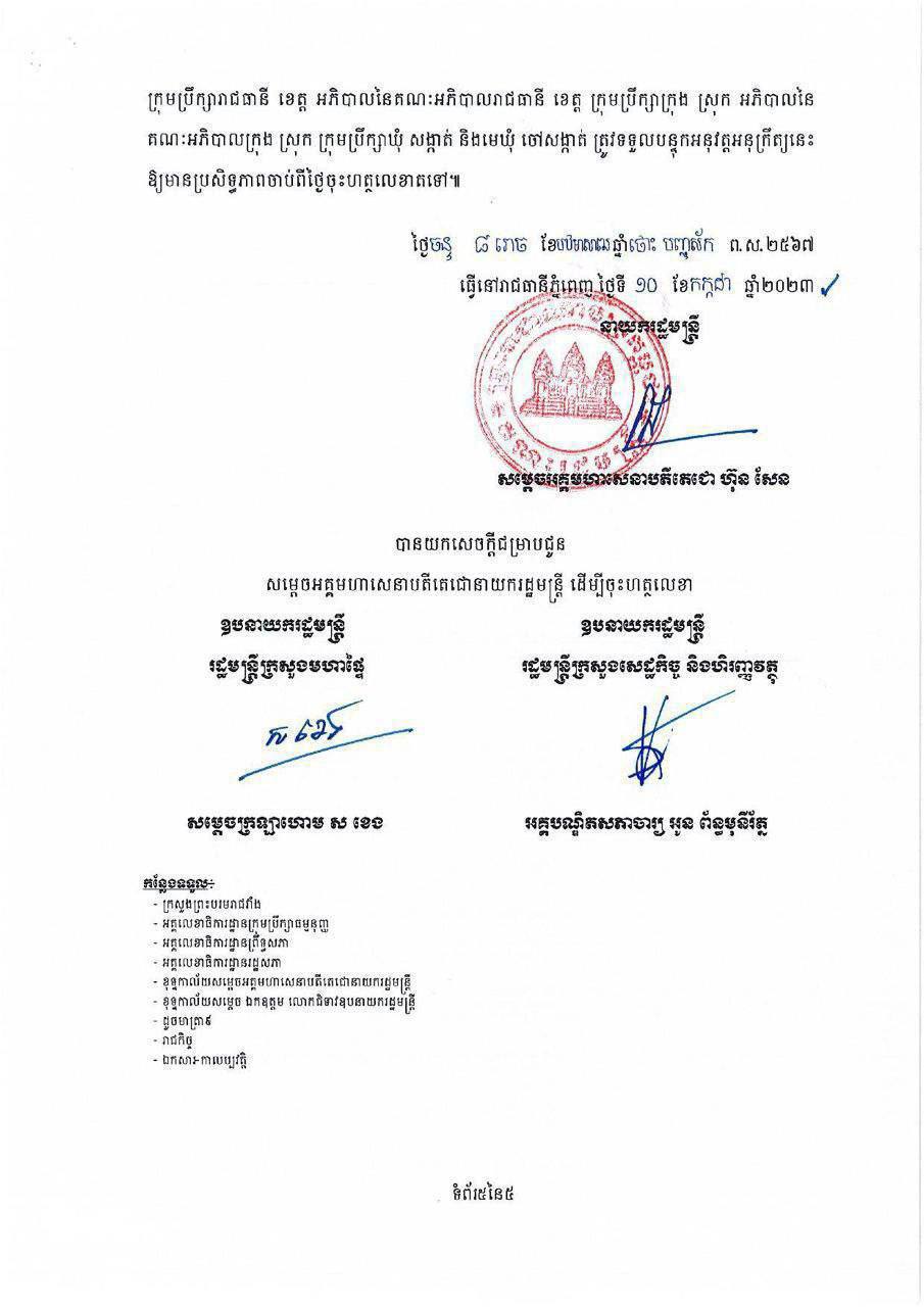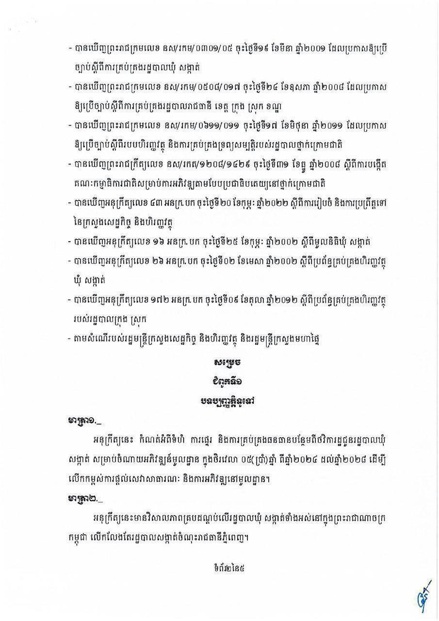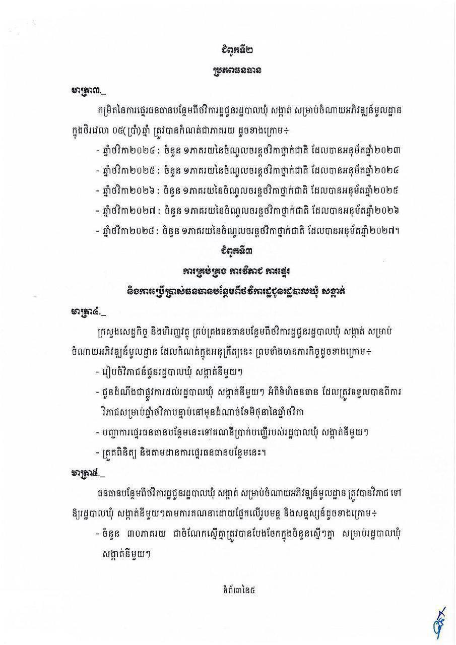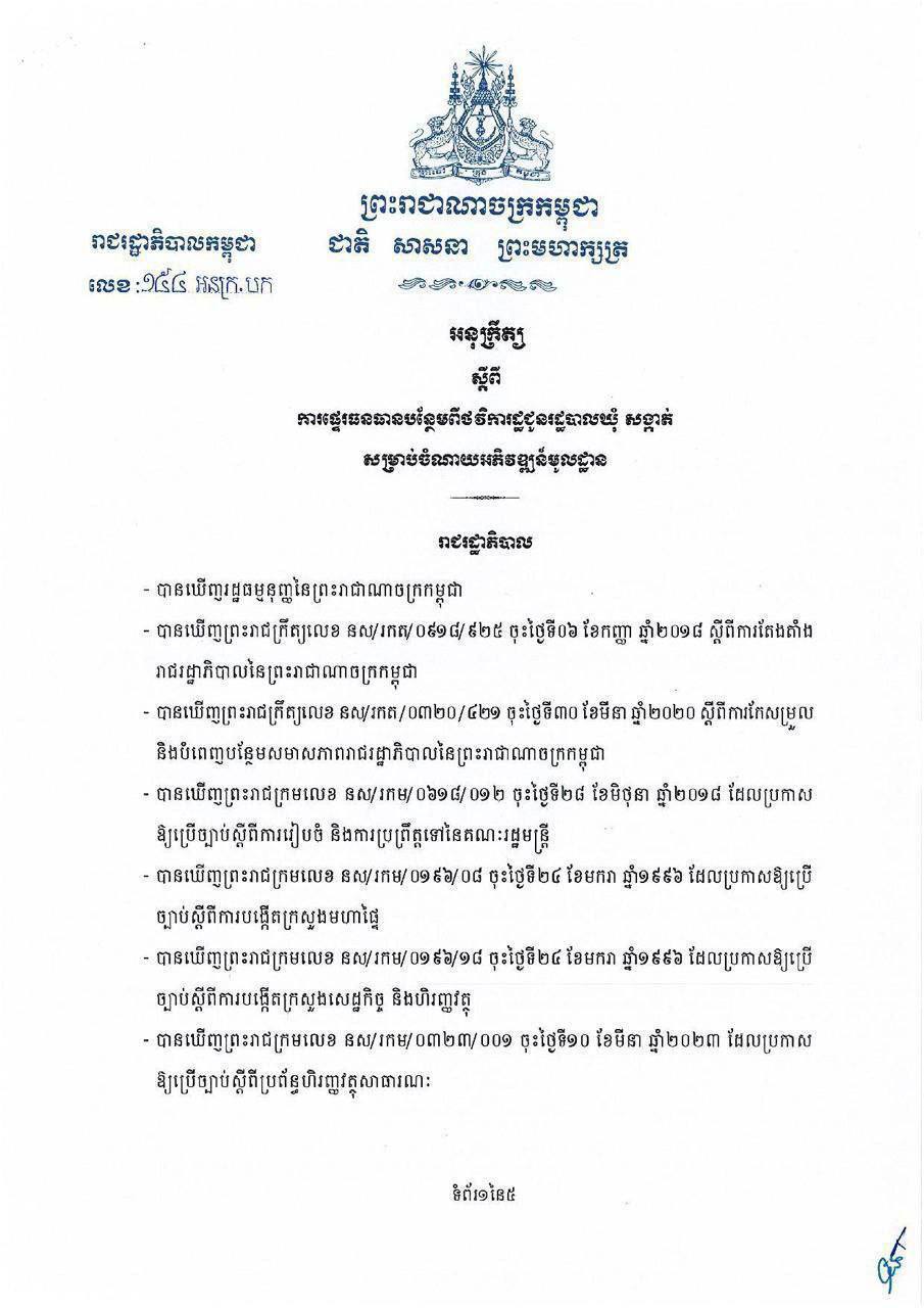 នាថ្ងៃទី ១០ ខែកក្កដា ឆ្នាំ ២០២៣ រាជរដ្ឋាភិបាលកម្ពុជាចេញអនុក្រឹត្យលេខ១៥៤ អនក្រ.បក ចុះថ្ងៃទី១០ ខែកក្កដា ឆ្នាំ២០២៣ ស្ដីពី ការផ្ទេរធនធានបន្ថែម ពីថវិការដ្ឋជូនរដ្ឋបាល ឃុំ សង្កាត់ សម្រាប់ចំណាយអភិវឌ្ឍន៍មូលដ្ឋាន ក្នុងថវិកា០៥ឆ្នាំ ពីឆ្នាំ២០២៤-២០២៨ ដើម្បីលើកកម្ពស់ការផ្តល់សេវាសាធារណៈ និងការអភិវឌ្ឍនៅមូលដ្ឋាន។