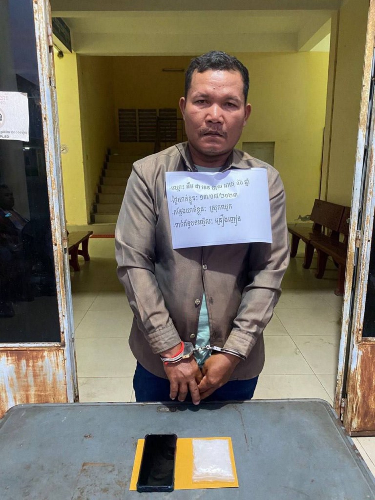 កំពត ៖ ក្រោមការដឹកនាំចង្អុលបង្ហាញពីលោកឧត្ដមសេនីយ៍ទោ ម៉ៅ ច័ន្ទមធុរិទ្ទ ស្នងការនគរបាលខេត្តកំពត នៅថ្ងៃទី១៣ ខែកក្កដា ឆ្នាំ២០២៣ វេលាម៉ោង ១៦ និង ០០នាទី កម្លាំងការិយា ល័យប្រឆាំងបទ ល្មើសគ្រឿងញៀន បានល្បាតក្នុងភូមិសាស្រ្ត ស្ពានអន្លង់ក្មេងលេង ស្ថិតក្នុងភូមិអន្លង់ក្មេងលេង ឃុំតេជោអភិវឌ្ឍន៍ ស្រុកឈូក ខេត្តកំពត ប្រទះឃើញមុខសញ្ញា កំពុងចែកចាយគ្រឿងញៀនកម្លាំងយើង បានឃាត់ខ្លួនជនសង្ស័យចំនួន ១ នាក់ ។