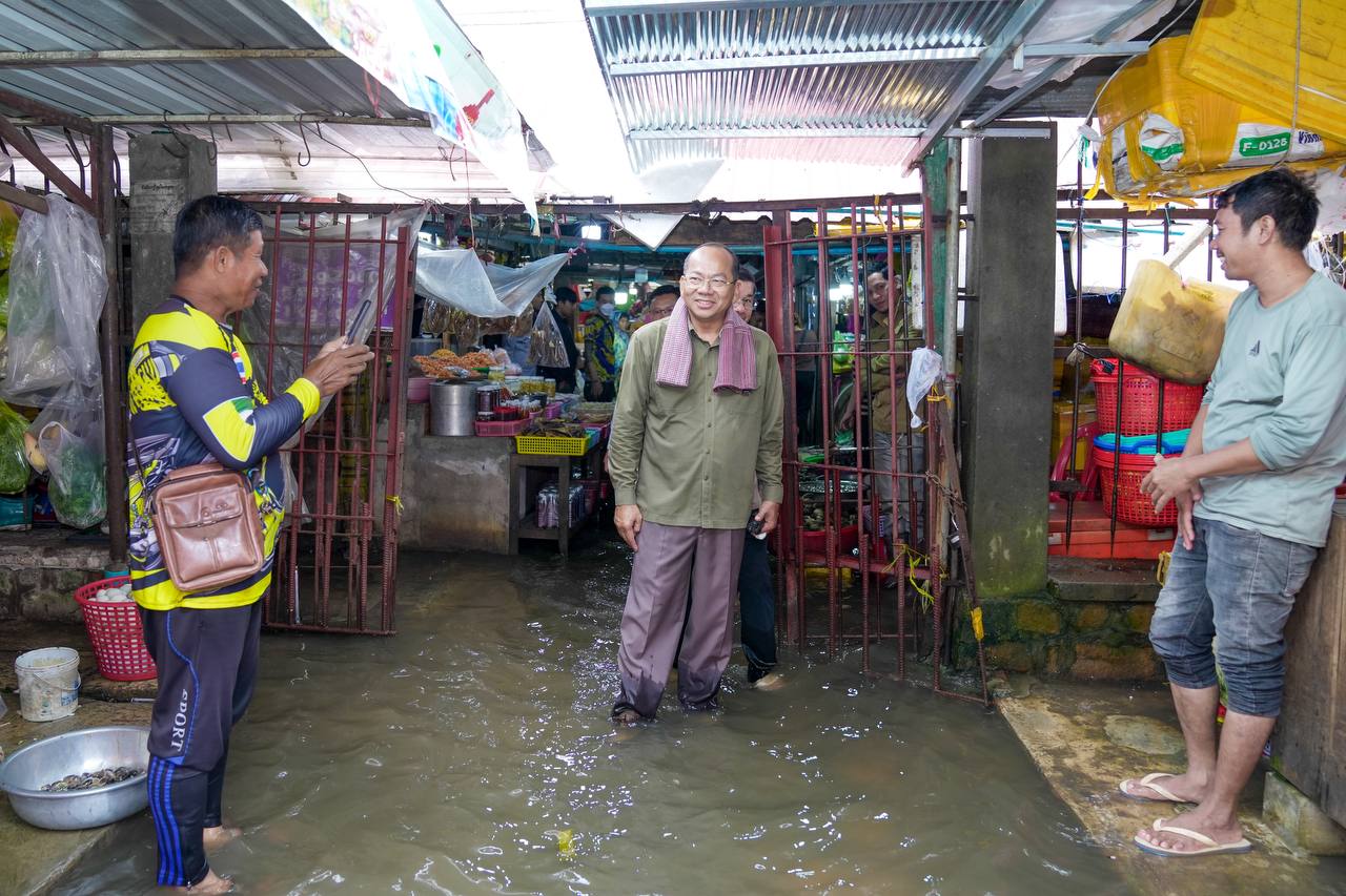 នៅព្រឹកថ្ងៃទី១៧ ខែកក្កដា ឆ្នាំ២០២៣ ក្រោយពីមានភ្លៀងធ្លាក់ជាបន្តបន្ទាប់ ឯកឧត្តម ម៉ៅ ធនិន អភិបាលខេត្តកំពត បានចុះទៅពិនិត្យដោយផ្ទាល់នូវស្ថានភាពទឹកក្នុងផ្សារសាមគ្គីខេត្តកំពត ដែលពីមុនមកឯកឧត្តមបានតម្រូវឱ្យអាជ្ញាធរក្រុងកំពត និងអ្នកវិនិយោគផ្សារពិនិត្យ និងស្ថារឡើងវិញនូវប្រព័ន្ធលូដោះទឹកចេញពីផ្សារនេះ ដើម្បីកុំឱ្យមានការជន់លិចបន្តទៀត។ ក្រោយពីចុះពិនិត្យឃើញជាក់ស្តែងក្រោយភ្លៀងមួយមេធំ ស្ថានភាពទឹកក្នុងផ្សារនៅតែបន្តមានការលិចផ្នែកខ្លះក្នុងផ្សារដដែល ភ្លាមនោះ ឯកឧត្តមអភិបាលខេត្តបានបញ្ជាឱ្យអាជ្ញាធរក្រុងកំពត ពិសេសអ្នកវិនិយោគផ្សារ ត្រូវរកដំណោះស្រាយបន្ទាន់ក្នុងការដោះទឹកចេញពីផ្សារនេះ។
