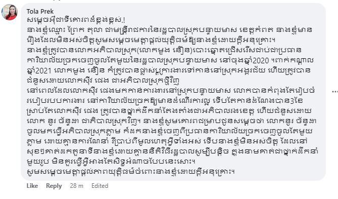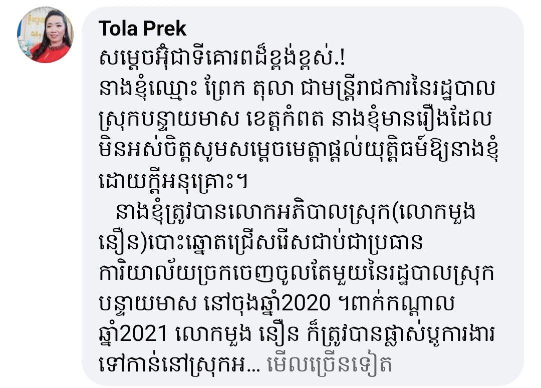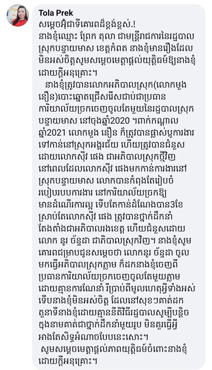 លោកស្រី ព្រែក តុលា បានសរសេរទៀតថា «នាងខ្ញុំត្រូវបានលោកអភិបាលស្រុក (លោក មួង នឿន) បោះឆ្នោតជ្រើសរើសជាប់ជាប្រធានការិយាល័យច្រកចេញចូលតែមួយ នៃរដ្ឋបាលស្រុកបន្ទាយមាស នៅចុងឆ្នាំ2020»។
