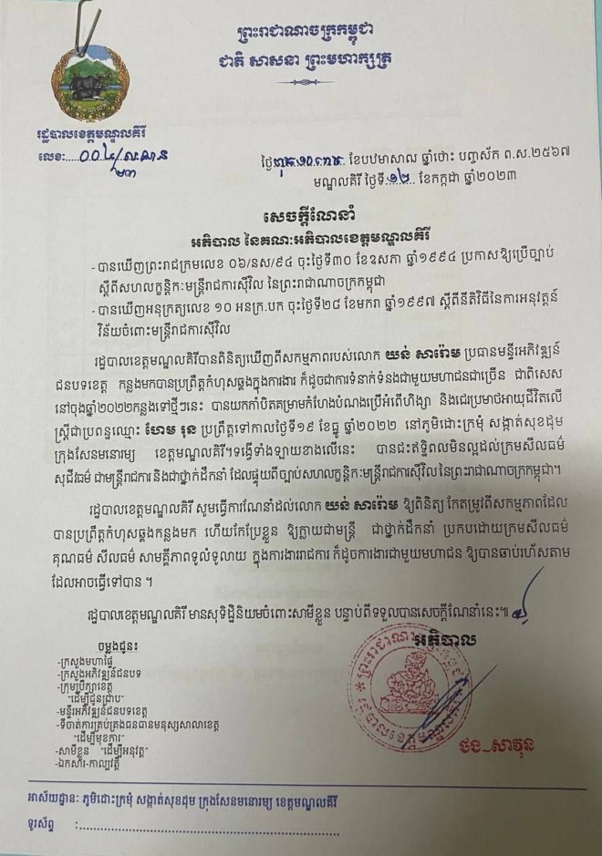 មន្ត្រីនគរបាលស្រុក អូររាំងបានប្រាប់បណ្ដាញ សារព័ត៌មាន ក្នុងស្រុកឲ្យដឹងថា កាលពីរវេលាម៉ោងជាង១រសៀល ថ្ងៃទី៣ ខែ សីហា ឆ្នាំ២០២៣ លោក យន់ សារោម បានធ្វើដំណើរចេញពីក្រុងសែន មនោរម្យ ក្នុងគោលដៅ ទៅពិនិត្យមើលផ្លូវដែលបាក់ស្រុត នៅចំណុចអូរងើយ ក្នុងស្រុកអូរាំង និង មើលដំណើរការ នៃការឈូសឆាយ ធ្វើផ្លូវវាង ដើម្បីអាចឲ្យរថយ ន្តតូច ធំធ្វើដំណើរជា បណ្ដោះអាសន្នសិន។