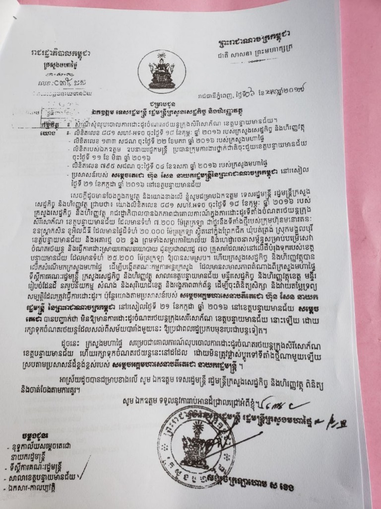 យោងតាមលិខិតលេខ ១៣៥៣ ស.ជ.ណ ចុះថ្ងៃទី ២៣ ខែវិច្ឆិកា ឆ្នាំ២០១៥ របស់ទីស្តីការគណៈរដ្ឋមន្ត្រី, លិខិតលេខ៦២៧ ស.ជ.ណ ផល ចុះថ្ងៃទី២០ ខែមិថុនា ឆ្នាំ២០១៦ របស់ទីស្តីការគណៈរដ្ឋមន្ត្រី, លិខិតលេខចុះថ្ងៃទី០២ ខែកក្តដា ឆ្នាំ ២០១៦ របស់លោកឧបនាយករដ្ឋមន្ត្រី កែ គឹមយ៉ាន និងយោងចំណារបស់សម្តេចតេជោ ហ៊ុន សែន នាយករដ្ឋមន្ត្រី ចុះថ្ងៃទី២៥ ខែកក្តដា ឆ្នាំ២០១៦ ។