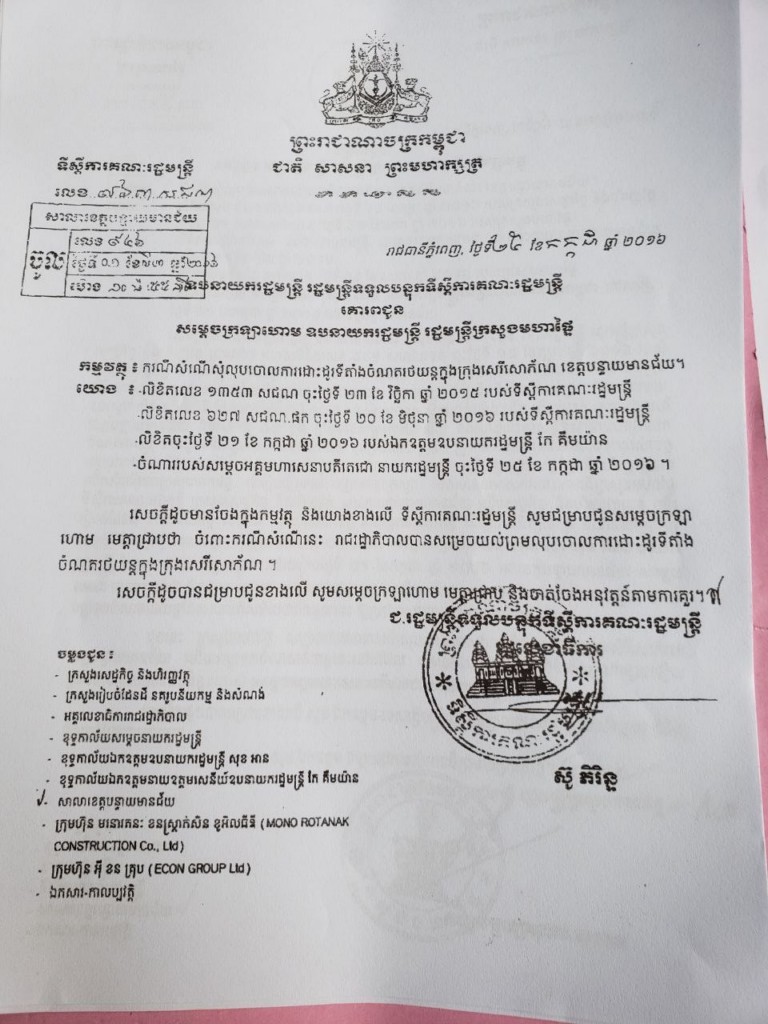 ពាក់ព័ន្ធករណីការដោះចំណតរថយន្តក្រុងសិរីសោភ័យ កន្លងមក ទីស្តីការគណៈរដ្ឋមន្ត្រី បានចេញលិខិតដោយបញ្ជាក់ថា «រាជរដ្ឋាភិបាលបានសម្រេចយល់ព្រមលុបចោលការដោះដូរទីតាំងចំណតរថយន្តក្នុងក្រុងសិរីសោភ័ណ យកទៅដាក់កន្លែងផ្សេងជាដាច់ខាត។ ទោះបីបេនឡាននេះដាច់អាណត្តិក៏ដោយប្រគល់ទៅឲ្យរដ្ឋបាលខេត្តបន្ទាយមានជ័យ កាន់កាប់ក៏ដោយរក្សាបេនឡានចាស់ ថ្មីនេះទុកនៅដដែល»។