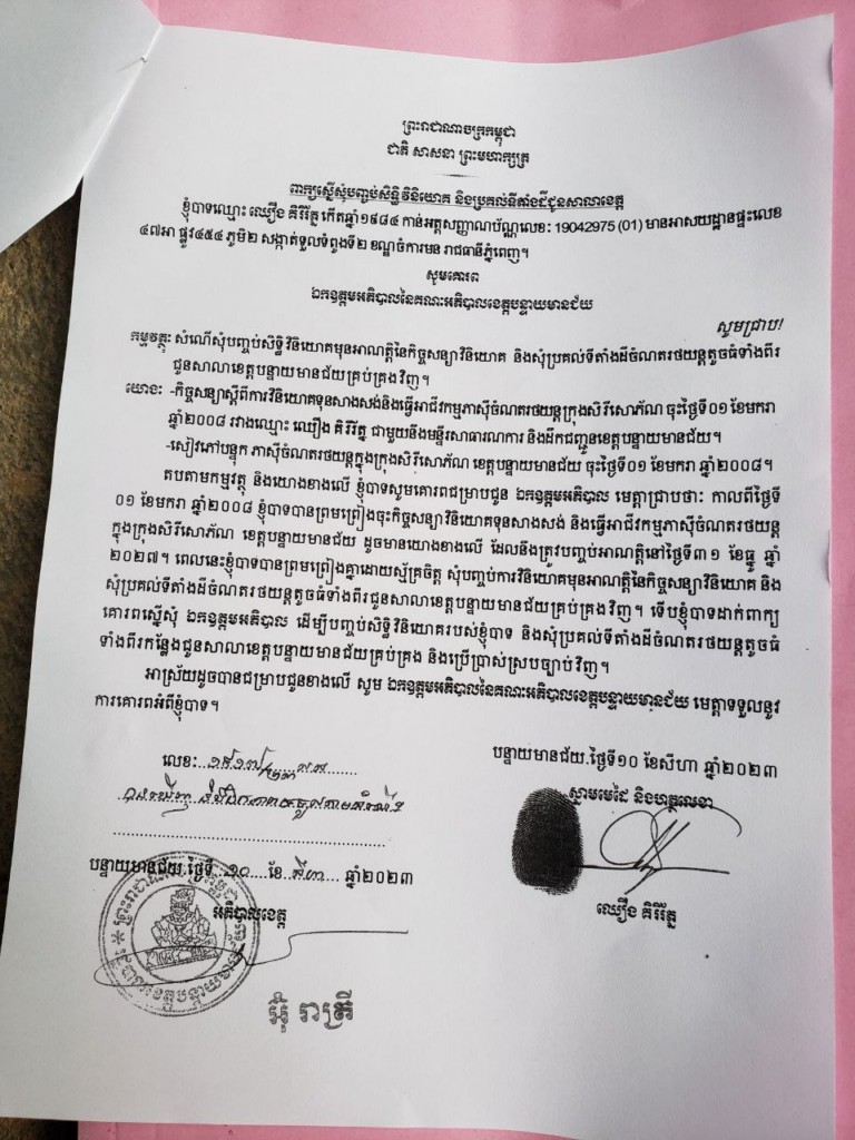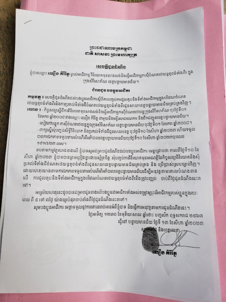 ក្នុងលិខិតចុះថ្ងៃទី១៣ ខែសីហា ឆ្នាំ២០២៣ របស់លោក ឈឿង គិរីរ៍ត្ន ថៅកែវិនិយោគចំណតរថយន្តទាំង ០២កន្លែង ក្នុងក្រុងសេរីសោភ័ណ ជម្រាបជូនបងប្អូនអាជីវករ អ្នករត់តាក់ស៊ីឲ្យបានជ្រាបថា «ក្រុមហ៊ុនបានស្នើសុំបញ្ចប់ការជួលតូប និងទីតាំងអាជីវកម្មក្នុងបរិវេណចំណតរថយន្តតូច ធំទាំងពីរក្នុងក្រុងសិរីសោភ័ណ ខេត្តបន្ទាយមានជ័យ។ ហេតុនេះ សូមបងប្អូនអាជីវករត្រូវរុះរើអាជីវកម្មរបស់ខ្លួនទាំងអស់ក្នុងរយ:ពេល ៥ទៅ៧ថ្ងៃ ជាកំណត់»។