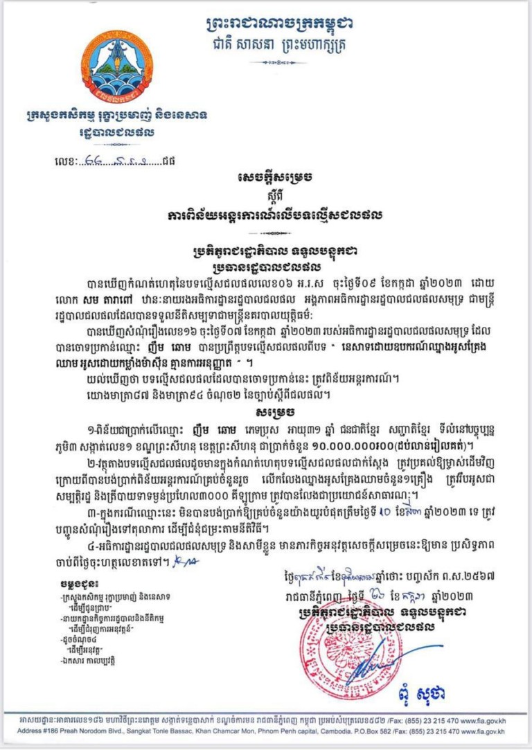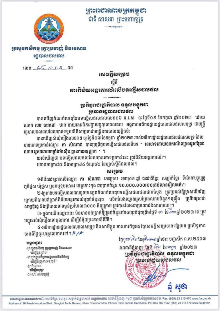លោក សម តារាពៅ ក៏បានបញ្ជាក់ផងដែរថានេះជាលើទី០២ហើយ ដែលសមត្ថកិច្ចបានធ្វើការ ចាប់ឃាត់ទូកទាំង០២ខាងលើ ។ គឺចាប់លើកទី០១ នៅថ្ងៃទី០៩ខែ កញ្ញា ឆ្នាំ២០២៣ ដោយកាលនោះតម្រូវឲ្យម្ចាស់ទូក ទាំង០២ធ្វើកិច្ចសន្យានៅចំពោះមុខមន្ត្រីមានសមត្ថកិច្ច បញ្ឈប់ការនេសាទល្មើសច្បាប់បែបនេះតទៅ ទៀត ព្រមទាំងបានធ្វើការផាកពិន័យអន្តរការណ៍លើបទល្មើសជលផល ក្នុងនោះឈ្មោះ ញឹម ឆោម ភេទប្រុស អាយុ៣១ឆ្នាំ ជនជាតិខ្មែរ សញ្ញាតិខ្មែរ ទីលំនៅបច្ចុប្បន្នភូមិ៣ សង្កាត់លេខ១ ខណ្ឌព្រះសីហនុ ខេត្តព្រះសីហនុ ជាប្រាក់ចំនួន ១០.០០០.០០០៛០០(ដប់លានរៀលគត់)និងឈ្មោះភា សំណាង ភេទប្រុស អាយុ៤២ ឆ្នាំ ជនជាតិខ្មែរ សញ្ជាតិខ្មែរ ទីលំនៅបច្ចុប្បន្នភូមិថ្មស ឃុំថ្មស ស្រុកបុទុមសាគរ ខេត្តកោះកុង ជាប្រាក់ចំនួន ១០.០០០.០០០៛០០(ដប់លានរៀលគត់)។ដោយឡែក-ចំពោះវត្ថុតាងបទល្មើសជលផល ដូចមានក្នុង កំណត់ ហេតុបទល្មើសជលផលជាក់ស្តែង ត្រូវប្រគល់ឱ្យម្ចាស់ដើមវិញលើកលែងឈ្នាង អូស គ្រែងឈាម ត្រូវរឹបអូស