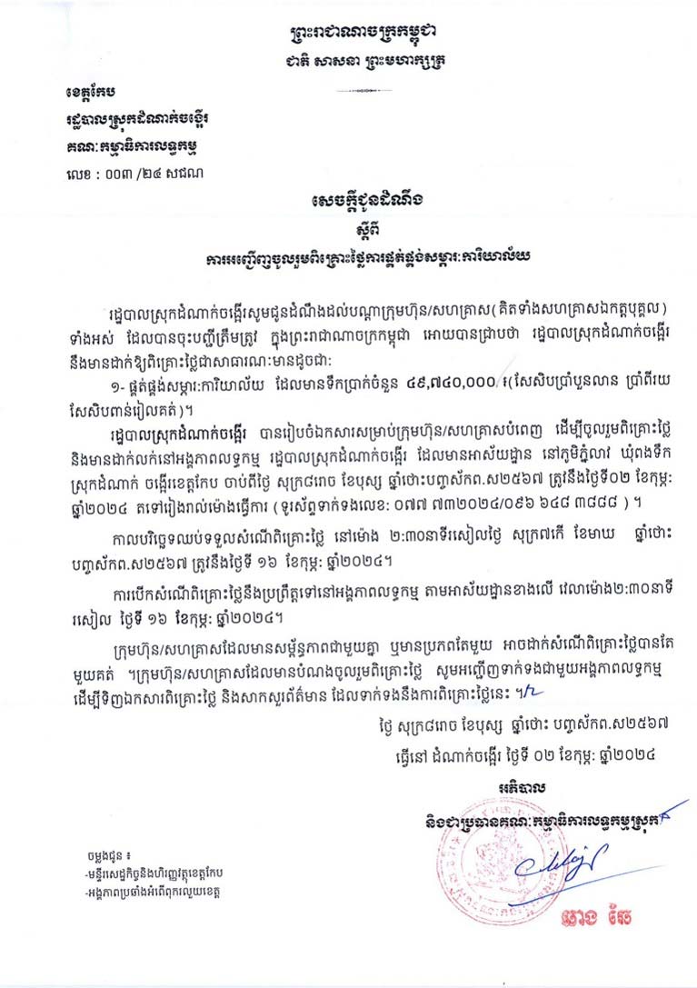 ​សាលាស្រុក​ដំណាក់​ចង្អើរ សូម​ជូនដំណឹង​ស្ដីពី ការអញ្ជើញ​ចូលរួម​ពិគ្រោះ​ថ្លៃ​ការផ្គត់ផ្គង់​សម្ភារៈ​: ការិយាល័យ​