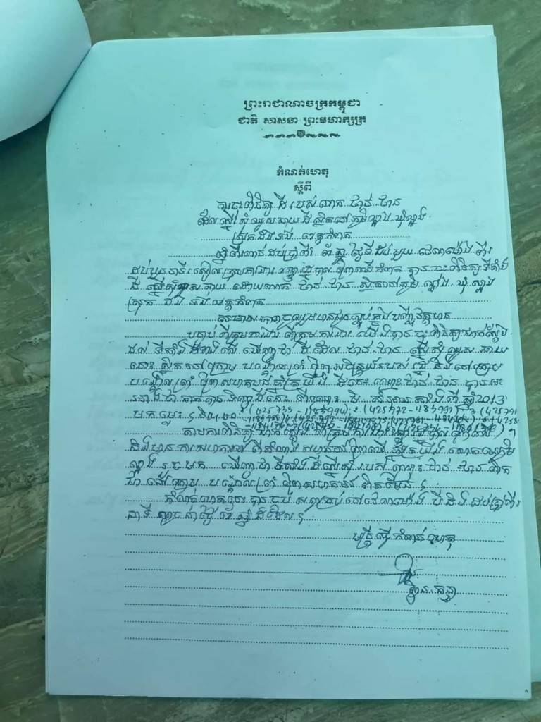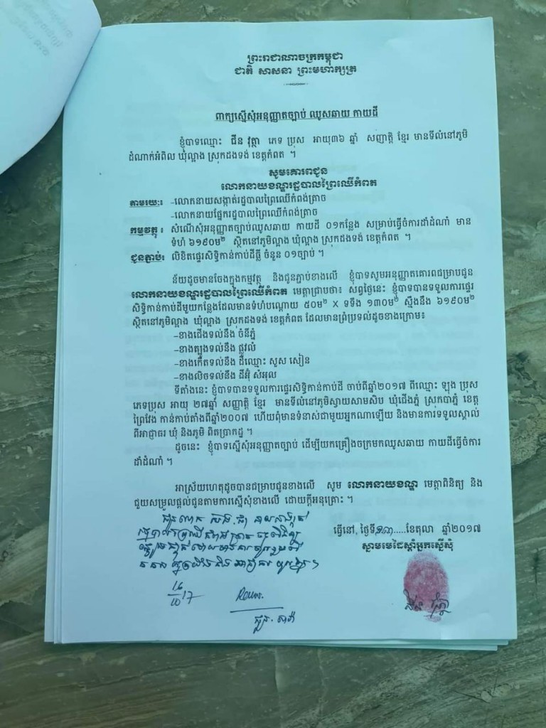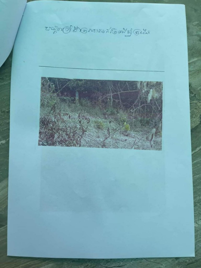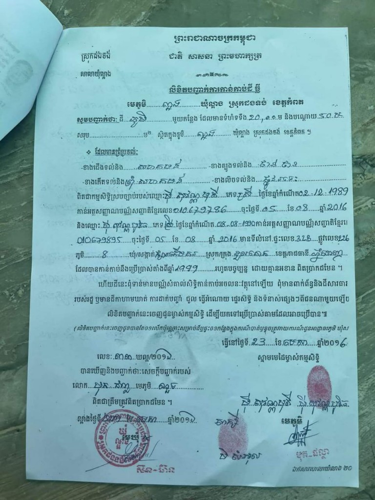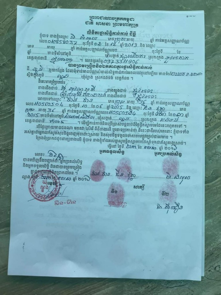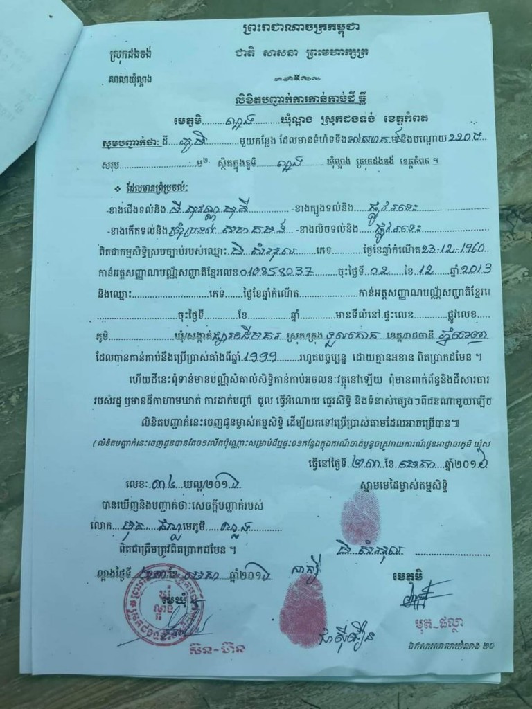 លោកបានទិញពីប្រជាពល រដ្ឋឈ្មោះ មិ អុល ភេទប្រុស .រស់នៅនៅសង្កាត់ផ្សារដើមគរ ខណ្ឌទួលគោក រាជនីភ្នំពេញ កាលពីឆ្នាំ ២ ២០១៦ លោកបានបញ្ជាក់ទៀតថា ដីរបស់គាត់ជាប់ ព្រំប្រទល់និងដីសហគមន៍ ខាងជើងជាប់ព្រំប្រទល់ឈ្មោះ មី សុវណ្ណមុតី ខាងត្បូងជាប់ផ្លូវរទេះ ខាងកើតជាប់ព្រំប្រទល់ជាមួយដីសហគមន៍ ខាងលិចជាប់ផ្លូវរទេះ។