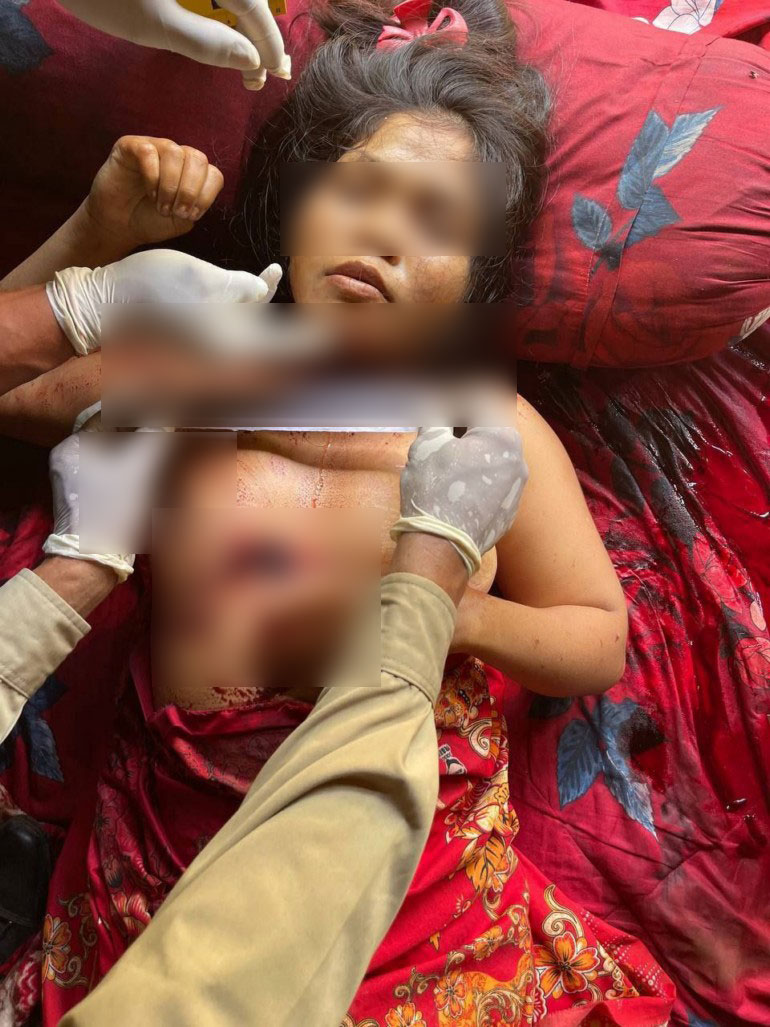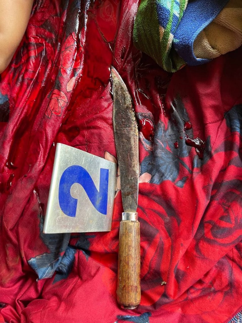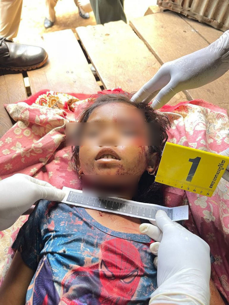 យើងឃើញមានសាកសព២នាក់ដេកក្នុងថ្លុកឈាមកូននឹងម្ដាយសាកសពម្នាក់ទៀតចងកនៅក្នុងបន្ទប់ជាមួយគ្នានៅទីនោះឃើញមានកាំបិតឈ្នាតដងឈើចុងស្រួច០១ប្រឡាក់ឈាមបន្សល់នៅជិតជនរងគ្រោះដេក។