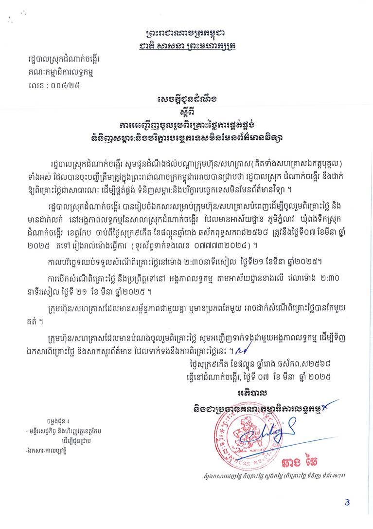 ​រដ្ឋបាល​ស្រុក​ដំណាក់​ចង្អើរ ​សូម​ជូន​ជូនដំណឹង ស្តីពី ​ការអញ្ជើញ​ចូលរួម​ពិគ្រោះ​ថ្លៃ​ការផ្គត់ផ្គង់ ទំនិញ​សម្ភារ​:​និង​បរិក្ខារ​បច្ចេកទេស​មិនមែន​ព័ត៌មានវិទ្យា​