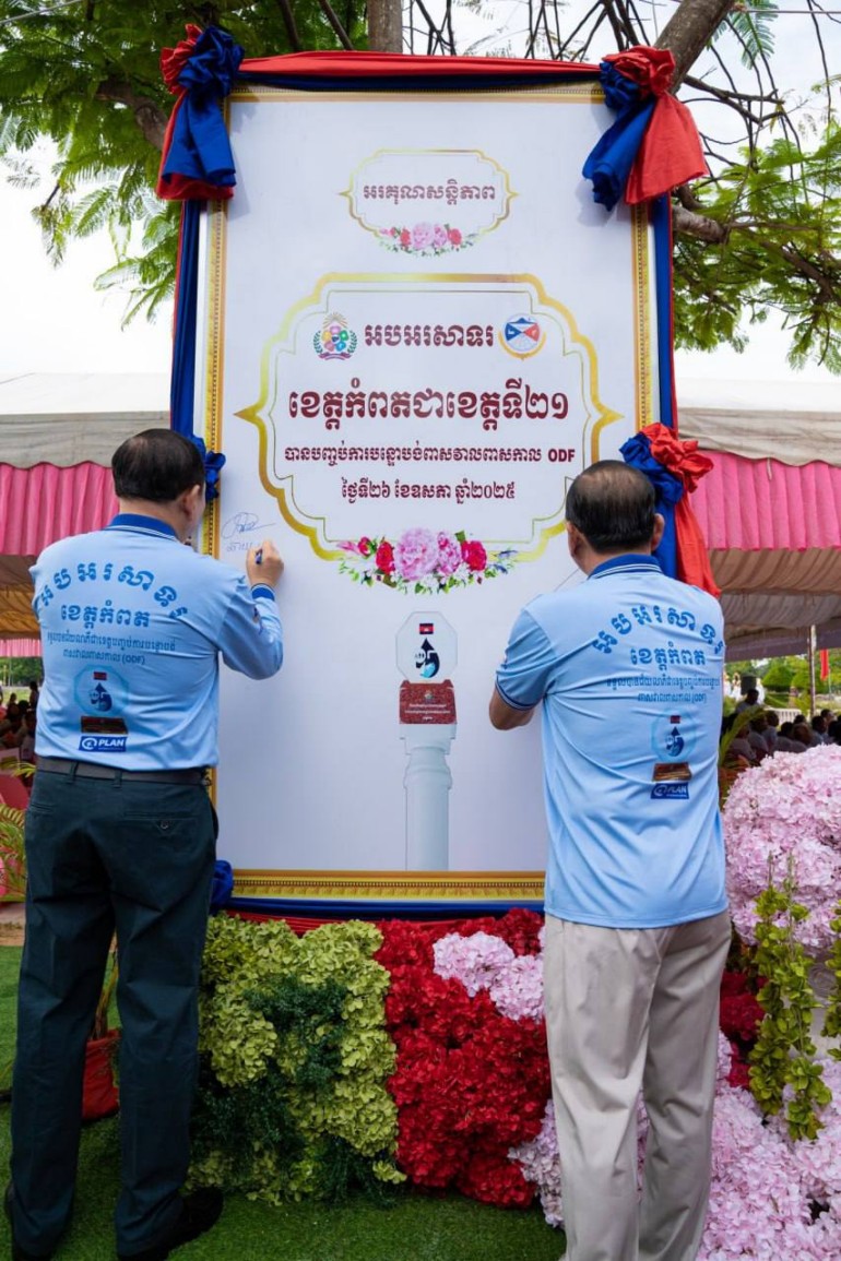 ខេត្តកំពត៖ នាព្រឹកថ្ងៃចន្ទ ១៥រោច ខែពិសាខ ឆ្នាំម្សាញ់ សប្ដស័ក ព.ស.២៥៦៨ ត្រូវនឹងថ្ងៃទី២៦ ខែឧសភា ឆ្នាំ២០២៥ ឯកឧត្តម ឆាយ ឫទ្ធិសែន រដ្ឋមន្ត្រីក្រសួងអភិវឌ្ឍន៍ជនបទ បានអញ្ជើញជាអធិបតីក្នុង ពីធីប្រកាសទទួលស្គាល់ជាផ្លូវការ ខេត្តកំពតជាខេត្តទី២១ ទទួលបានជ័យលាភីបញ្ចប់ការបន្ទោបង់ពាសវាលពាសកាល (ODF)។