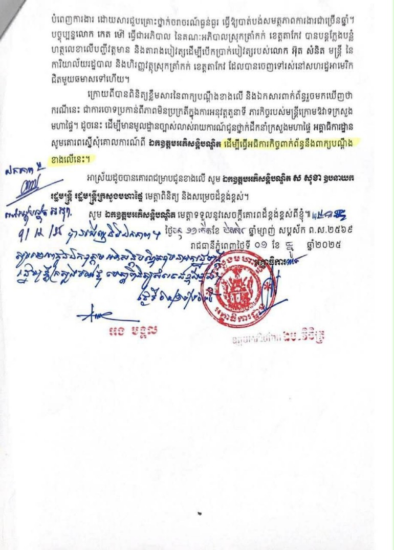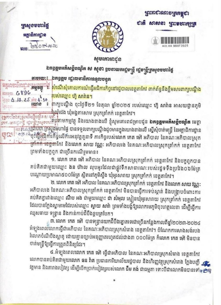 [ភ្នំពេញ]៖ ករណីមិនប្រក្រតីនៅខេត្តតាកែវបានផ្ទុះឡើងជាថ្មី បន្ទាប់ពីអគ្គាធិការដ្ឋាននៃក្រសួងមហាផ្ទៃ បានសម្រេចចាត់តាំងមន្ត្រីចុះធ្វើអធិការកិច្ចជាបន្ទាន់លើលោក កេត ម៉ៅ អភិបាលស្រុកត្រាំកក់ និងលោក សាយ វណ្ណៈ អភិបាលរងស្រុក ព្រមទាំងបក្ខពួក ជុំវិញបណ្តឹងរំលោភអំណាច និងទន្ទ្រានយកទ្រព្យសម្បត្តិរដ្ឋ។