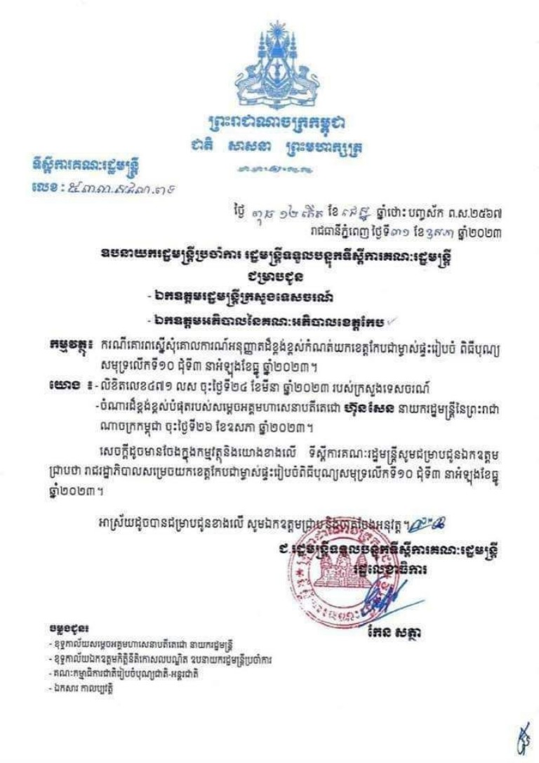 ទីស្តីការគណៈរដ្ឋមន្ត្រី សូមជម្រាបជូនថា រាជរដ្ឋាភិបាលបានសម្រេចយកខេត្តកែប ជាម្ចាស់ផ្ទះរៀបចំ ពិធីបុណ្យសមុទ្រ ជុំទី៣ លើកទី១០ នាអំឡុងខែធ្នូ ឆ្នាំ២០២៣នាពេលខាងមុខ។